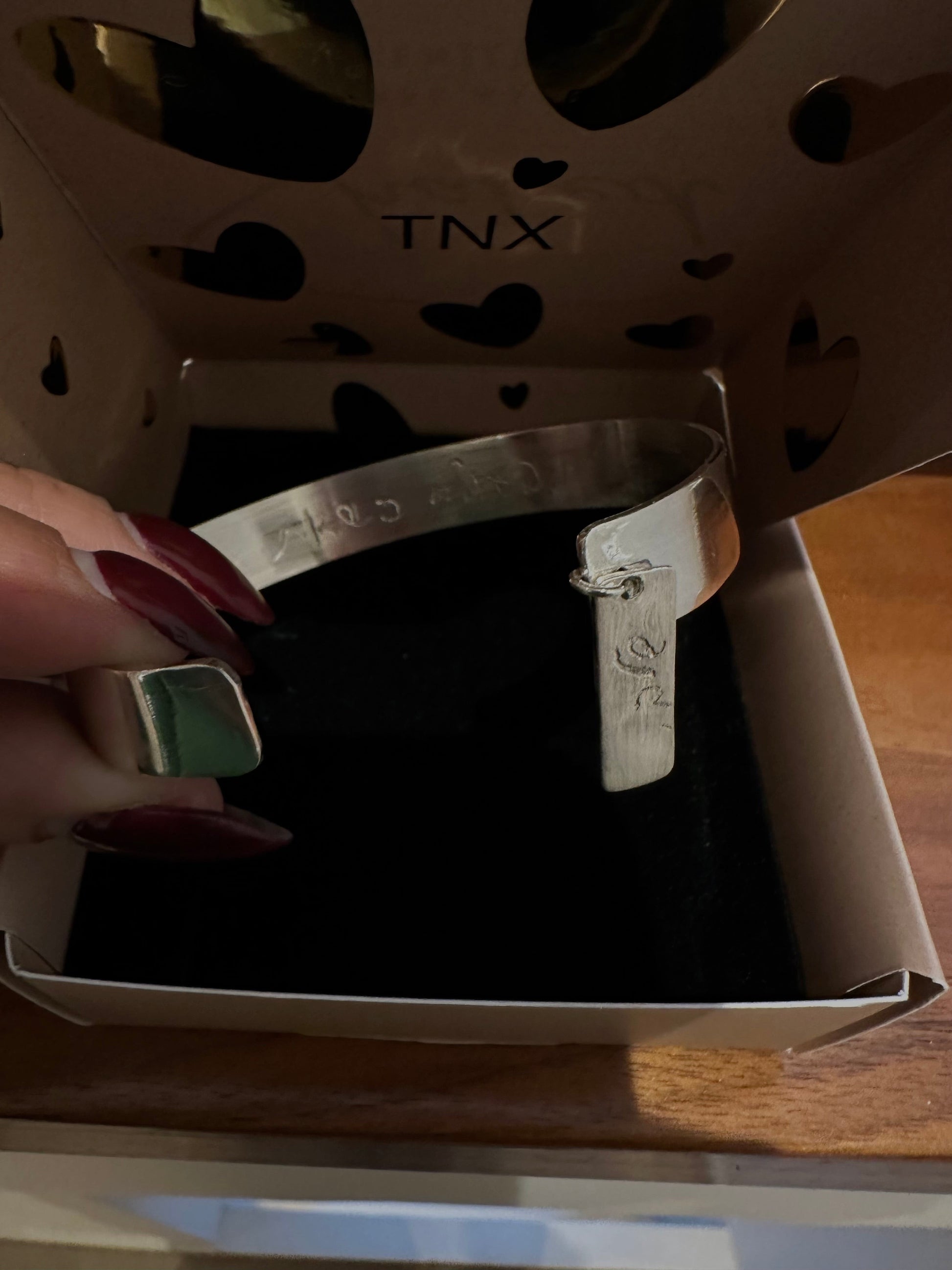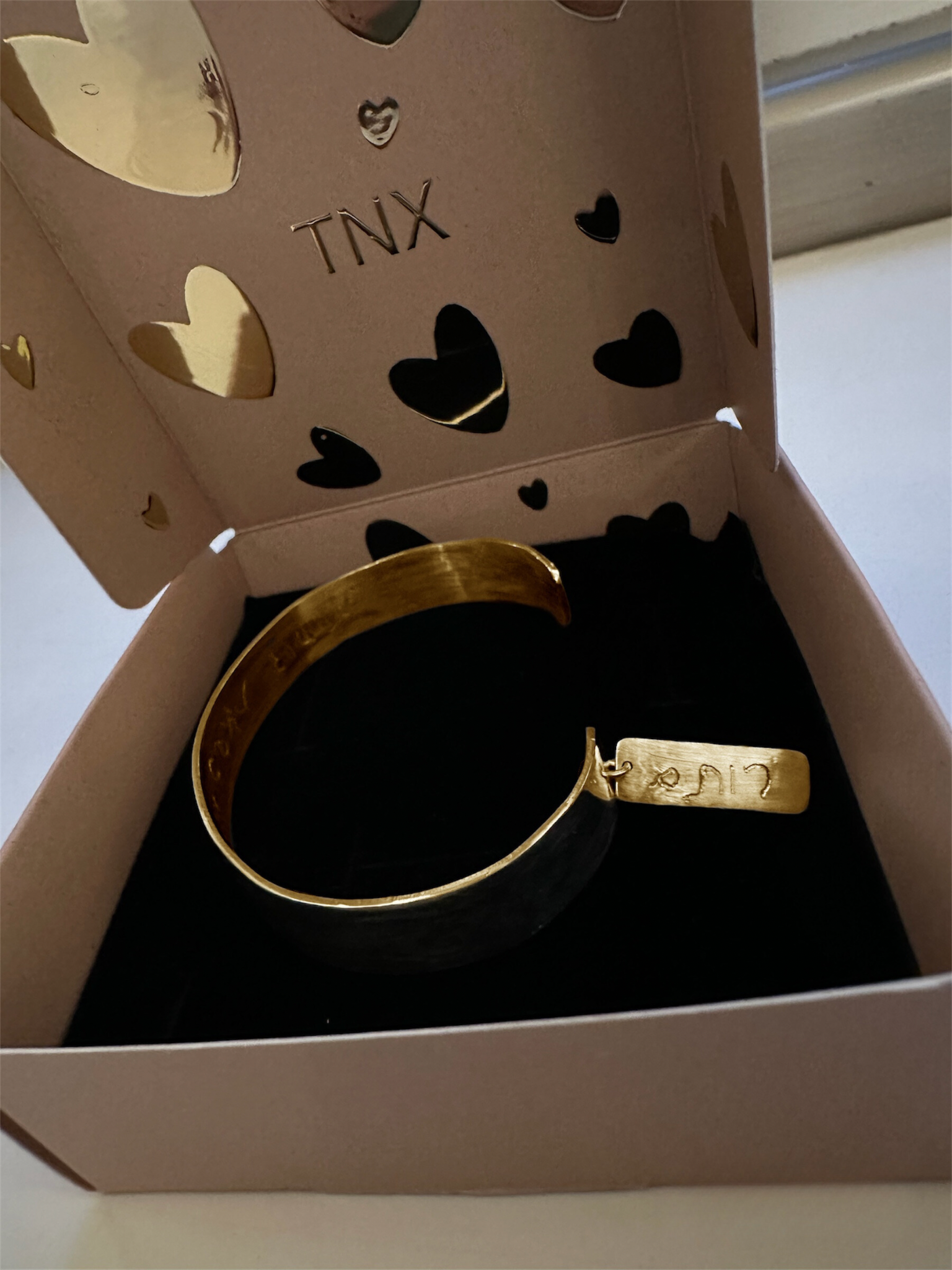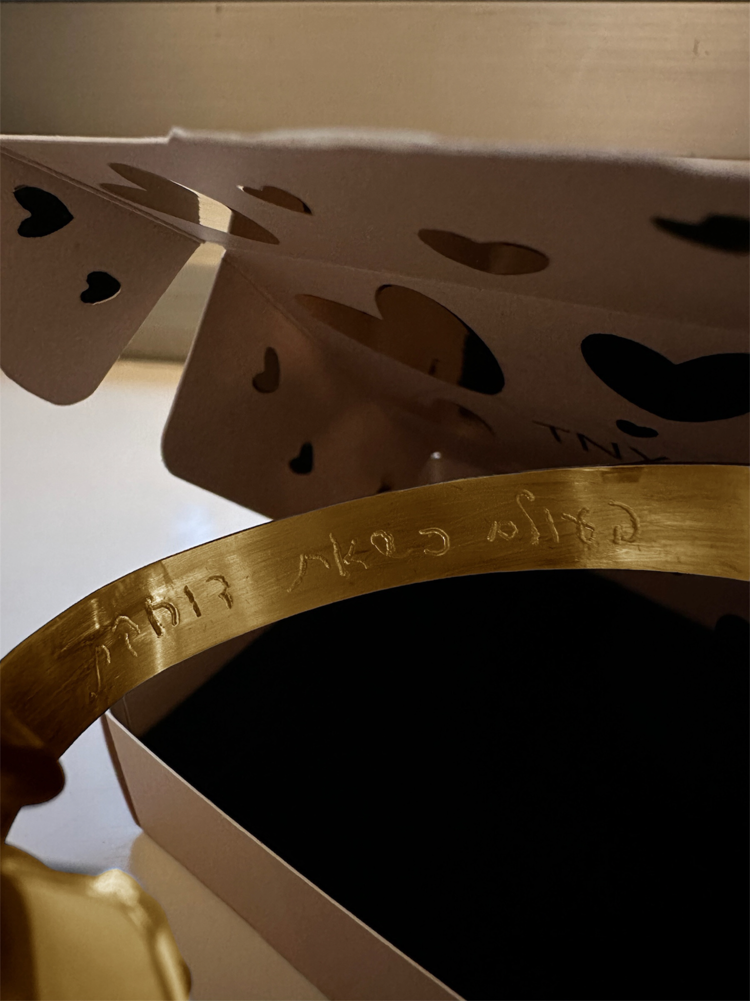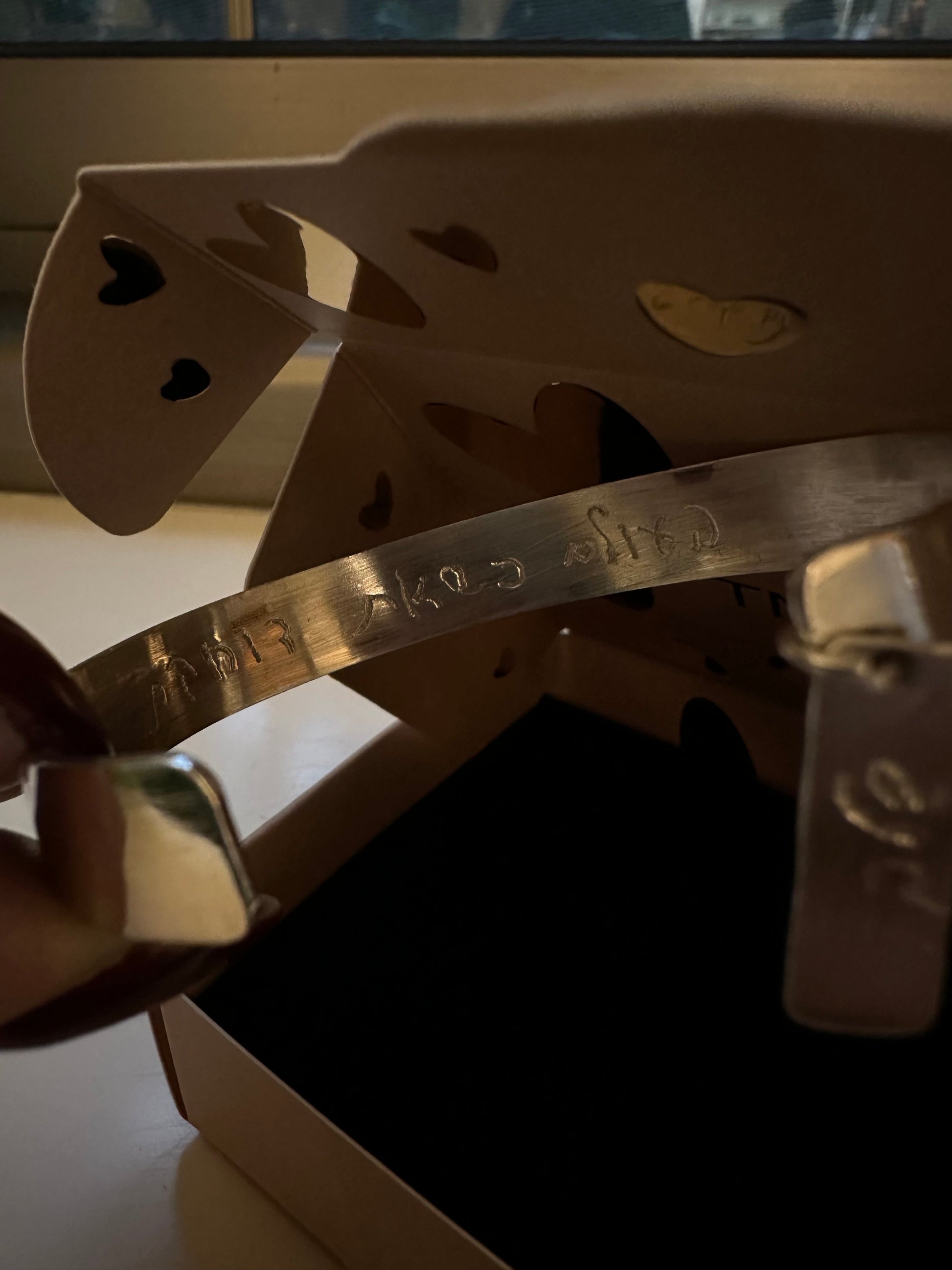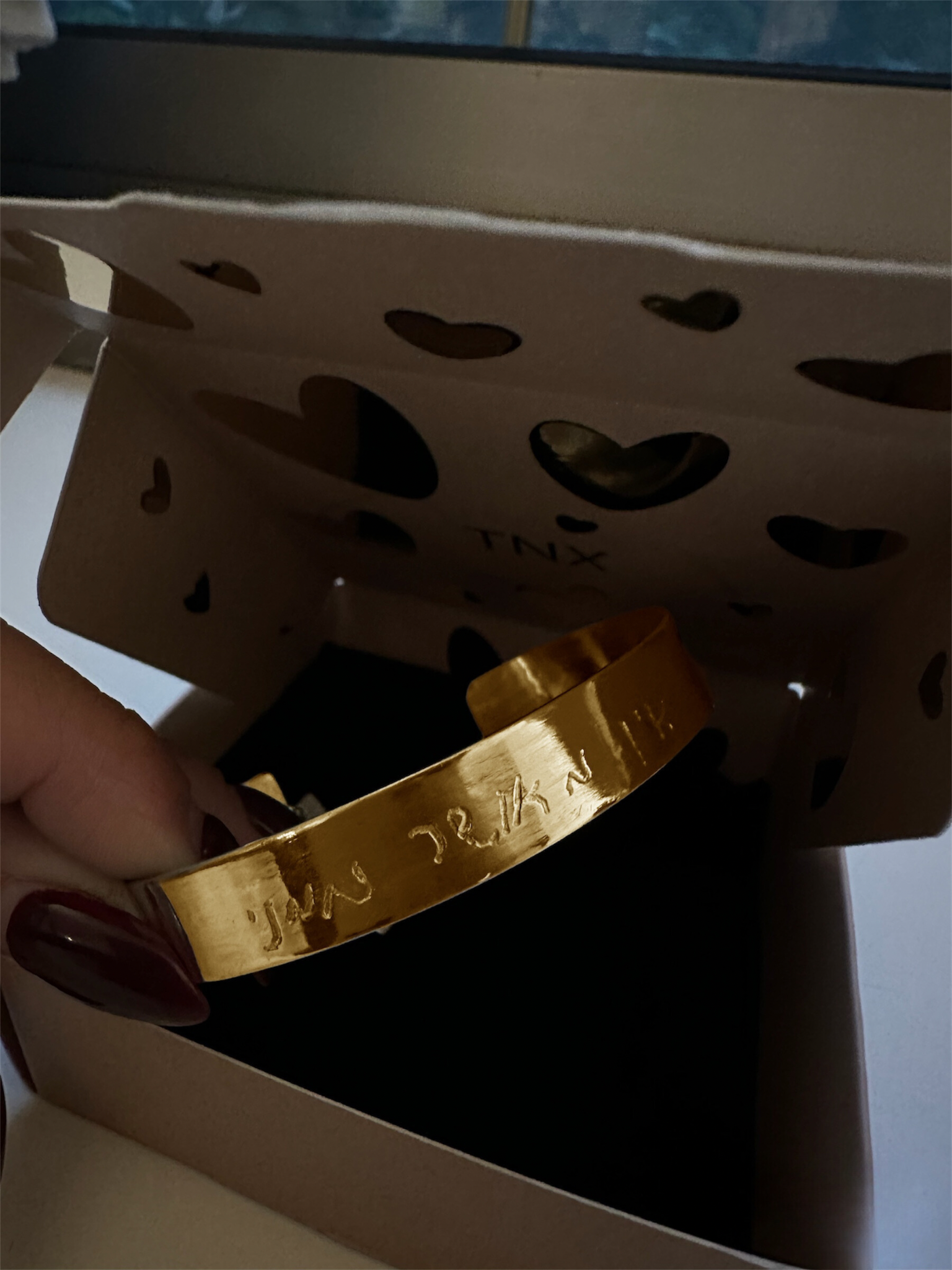 הצמיד כולו עשוי ממתכות יוקרה ומיוצר בעבודת יד מלאה, עם מקום לכל חריטה שאפשר לחלום עליה, באיזו שפה שתבקשי.
