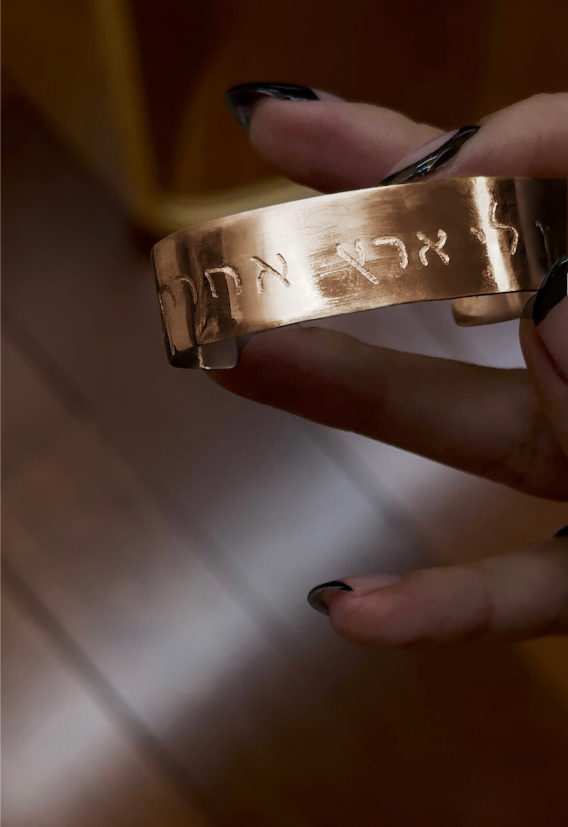 ״אין לי ארץ אחרת״ בחלקו החיצוני של הצמיד, ״גם אם אדמתי בוערת״ בחלקו הפנימי.