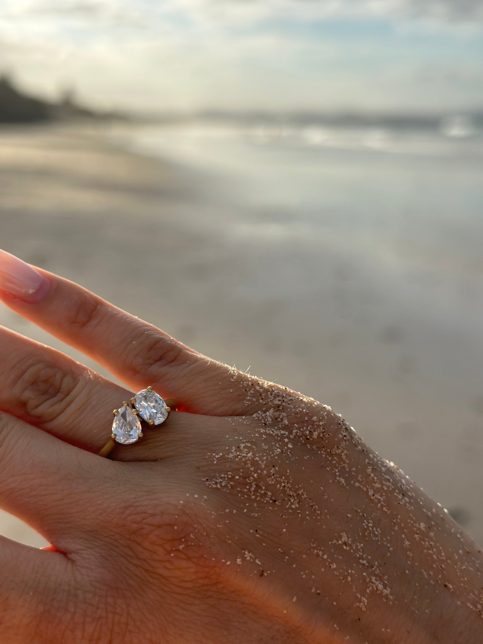 הטבעת משלבת 2 יהלומים מרכזיים דומיננטיים, בחיתוכים אובל וטיפה.