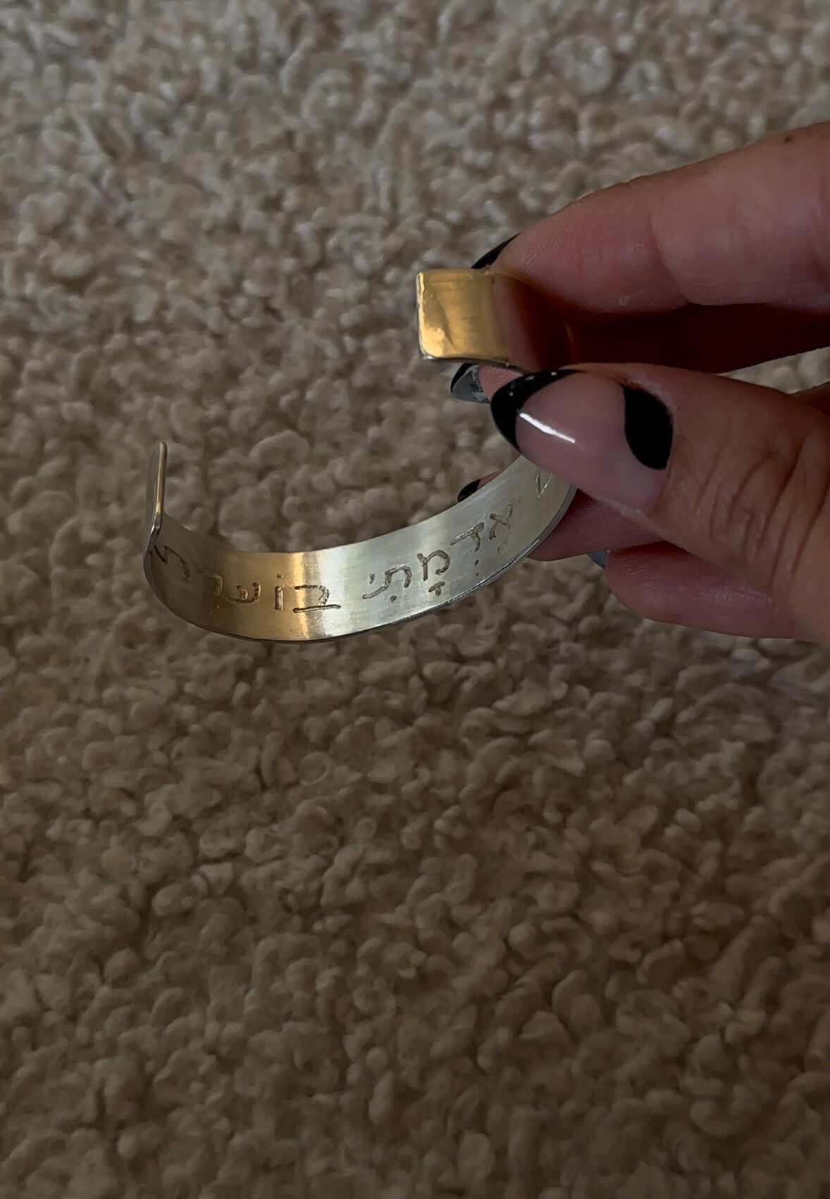 הצמיד כולו עשוי ממתכות יוקרה ומיוצר בעבודת יד מלאה, עם מקום לכל חריטה שאפשר לחלום עליה, באיזו שפה שתבקשי.