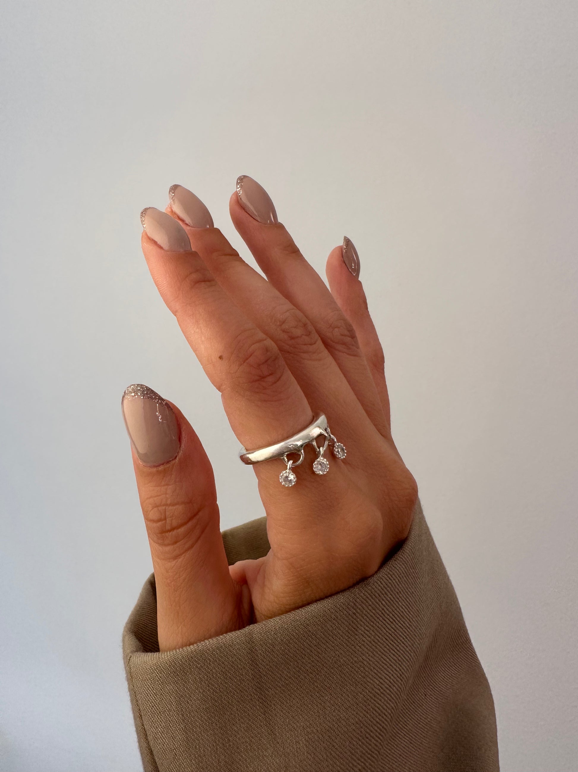 הטבעת בעלת 3 תליונים משובצים זרקונים עגולים, שקפקפים ומנצנצים.