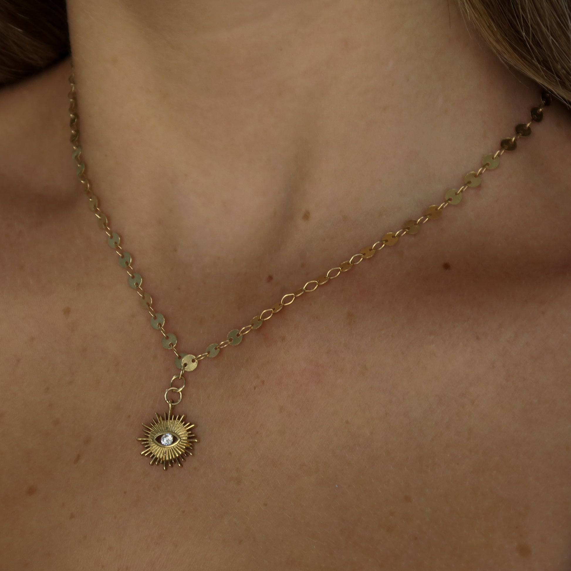 מורכבת משרשרת צ׳ארם גולד, בשילוב תליון עגול וחריטה של שמש במרכזה זרקון משובץ בצורת עין, נגד ״עין הרע״.