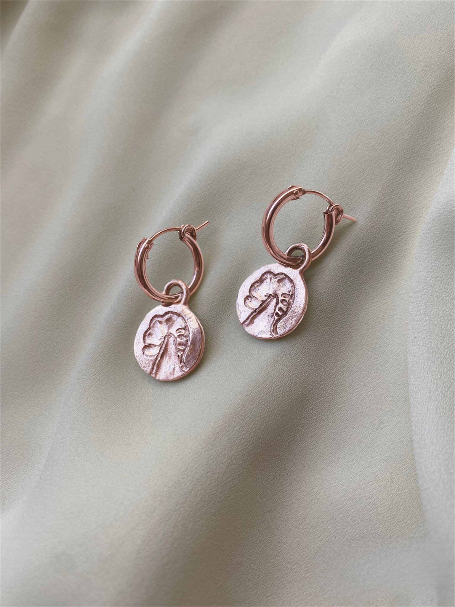 עגילי חישוק בסגנון ג׳יפסי, שעל כל אחד נתלה תליון בסגנון קמאו, מגולף בדמות של סבתא אמיליה. את הגילוף התאמתי לתמונה בה אמיליה נמצאת.