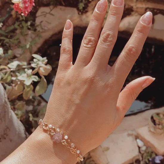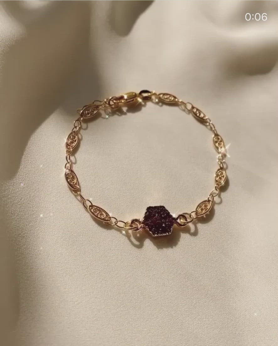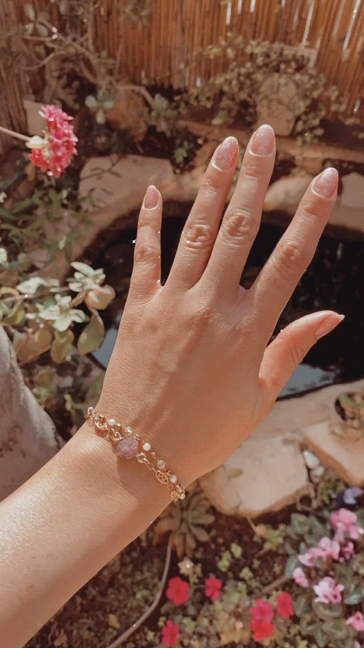 עשוי גולדפילד 14 קארט, בתוספת תליון אבן קוורץ בגווני אמטיסט- סגול עמוק/סגול בהיר.