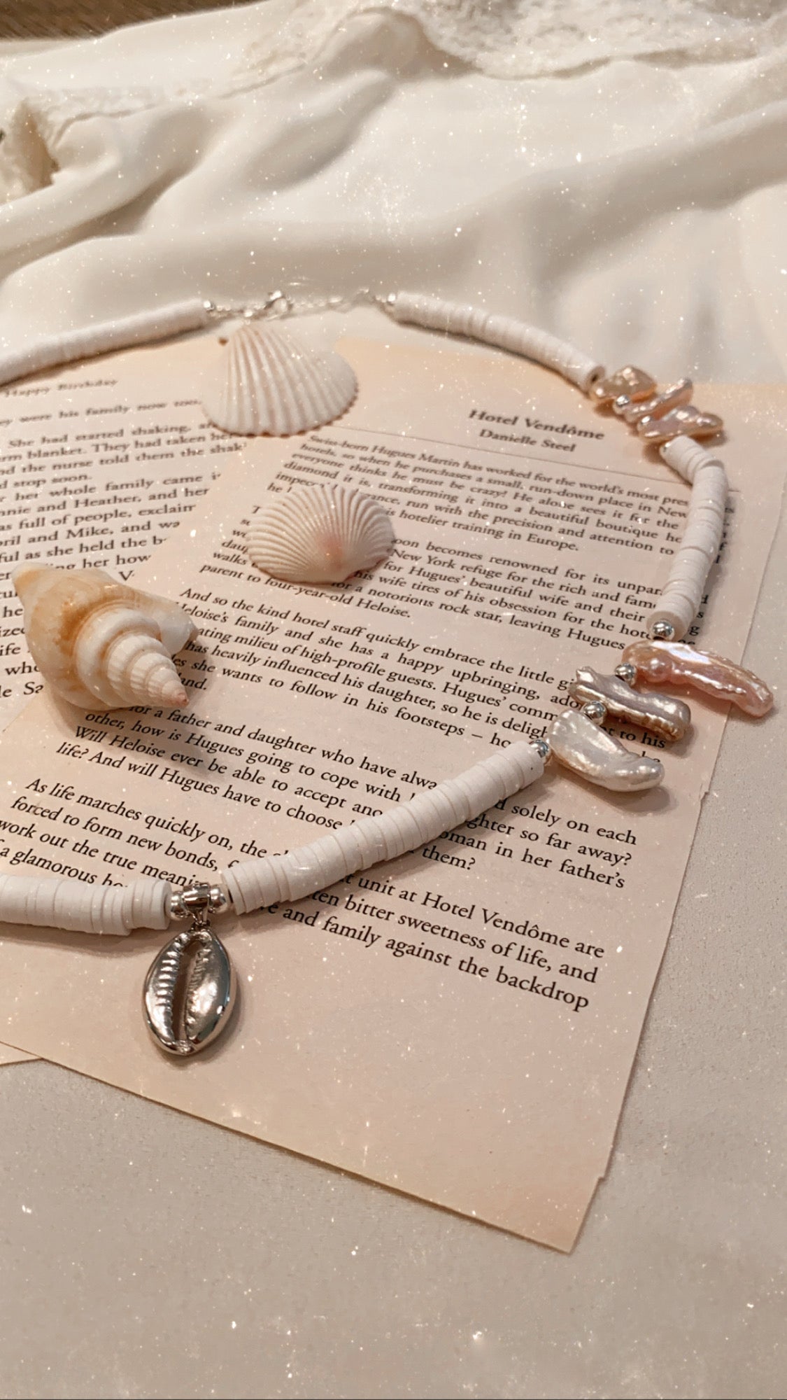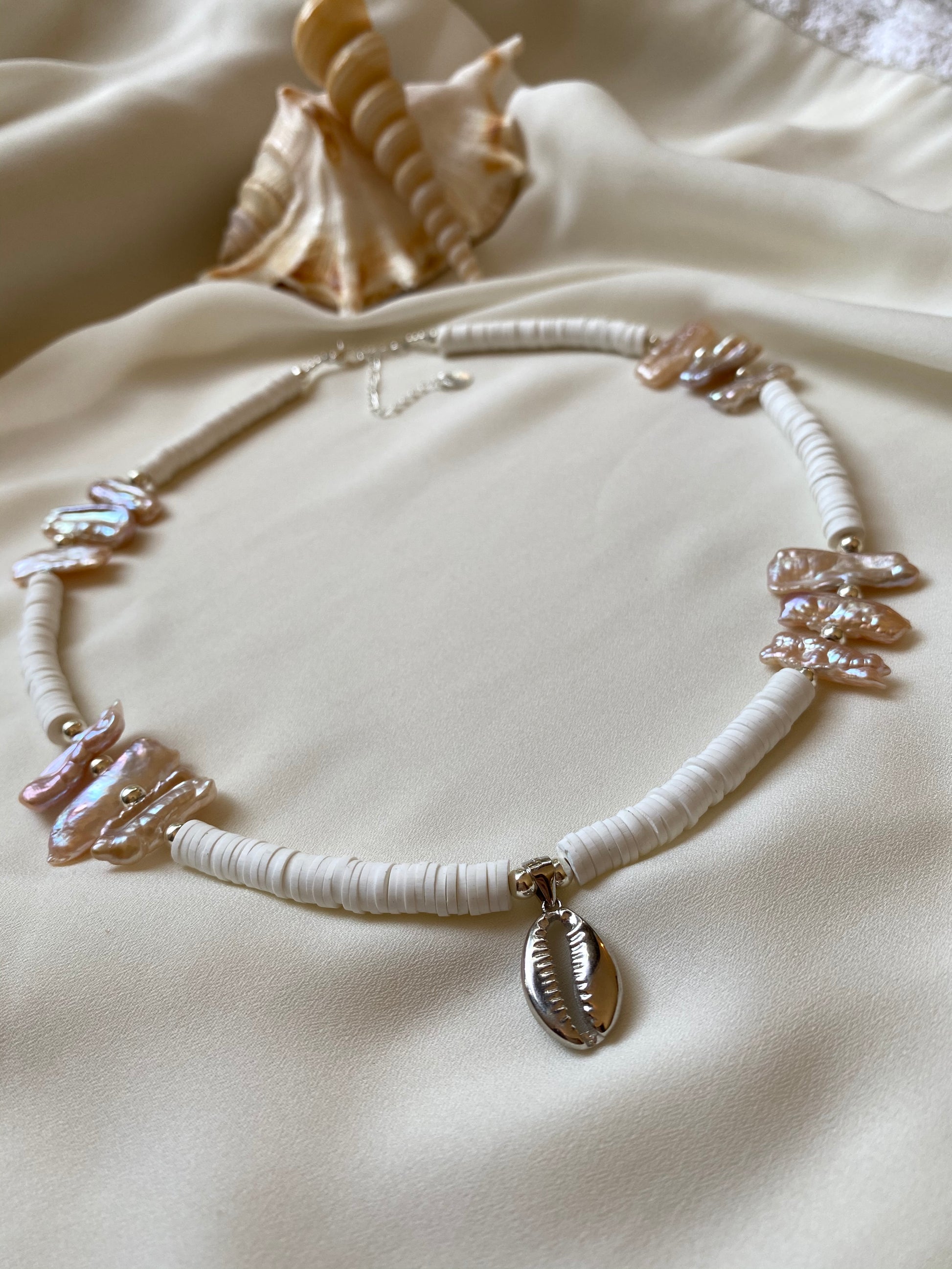 השרשרת עשויה חרוזי סיליקון לבנים בשילוב פניני מים מתוקים טבעיות אמיתיות, בגווני ורדרד סגלגל- אפרפר המשנות את צבען מהאחת לשניה, בתוספת חרוזי כסף טהור 925 ותליון צדף מושלם במרכז.