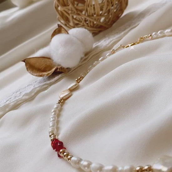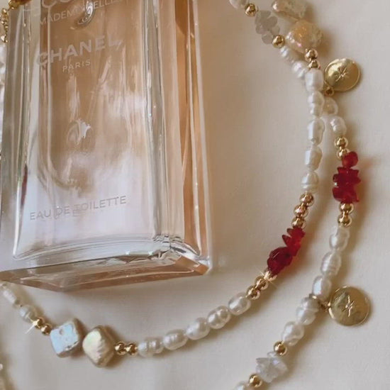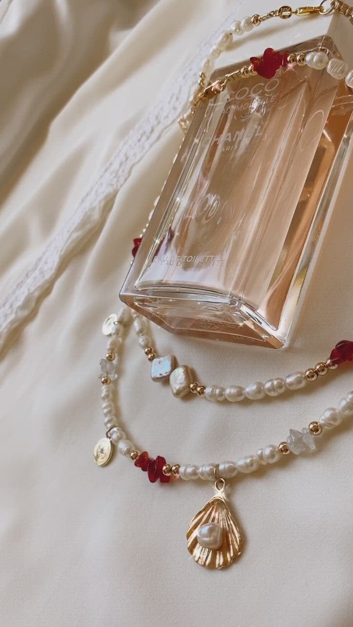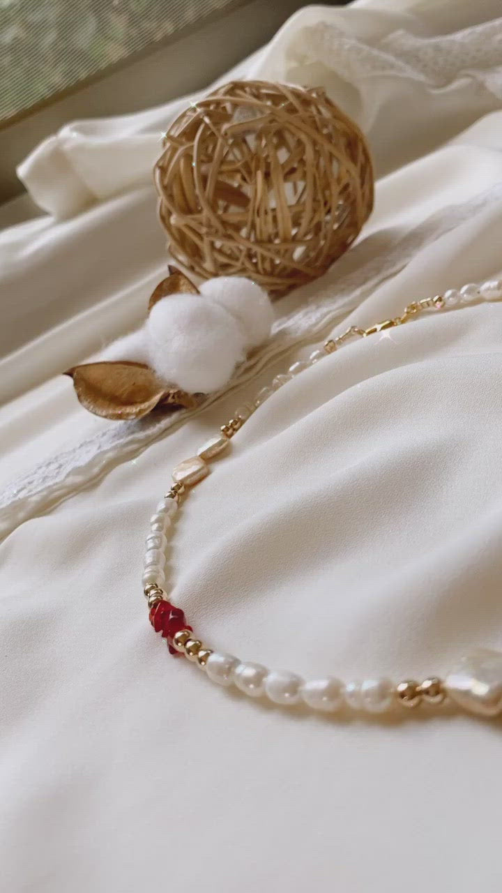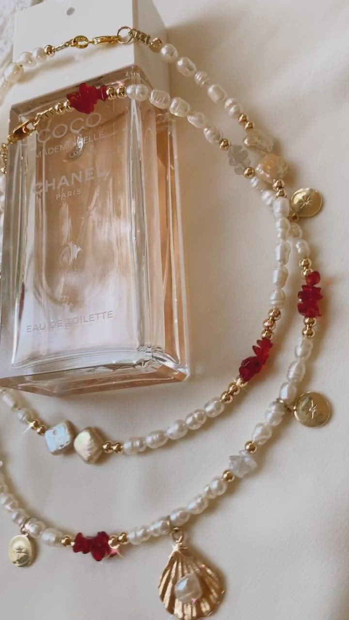 עשויה פניני מים מתוקים אמיתיות טבעיות משני סוגים שונים בגווני שמנת/דבש, בשילוב אבני קט-איי דומיננטיות אדמדמות וחרוזי גולדפילד 14 קארט.