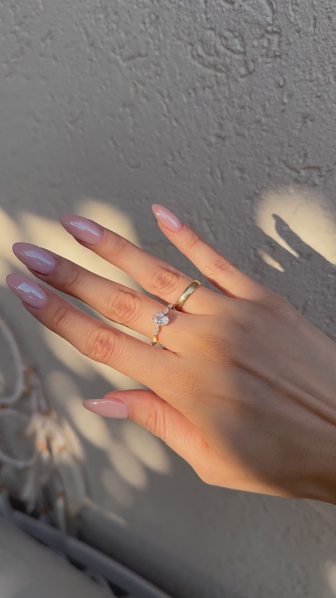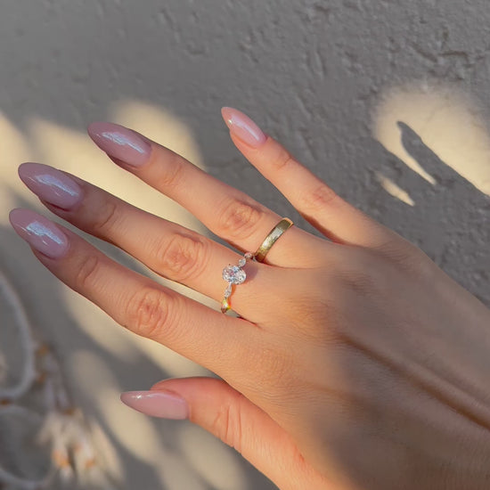 טבעת קלאסית ועדינה, משובצת יהלום מרכזי אובל בשילוב יהלומי מרקיזות משני צידי האבן המרכזית.