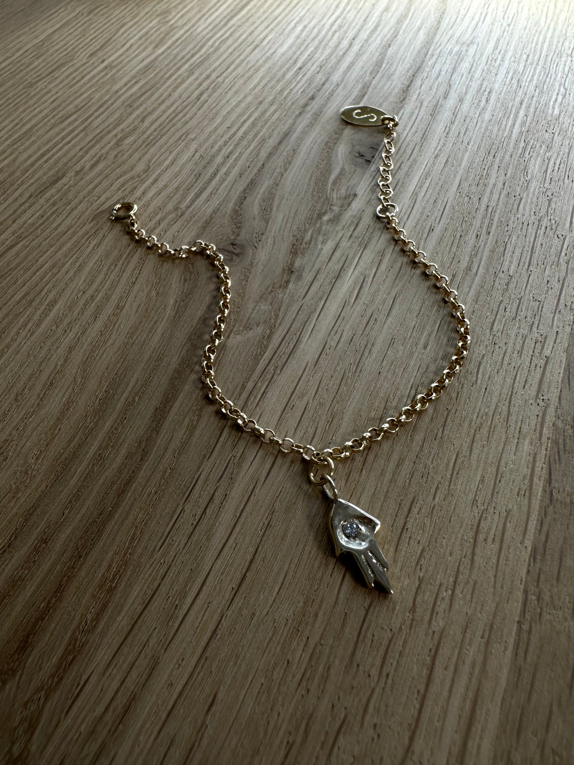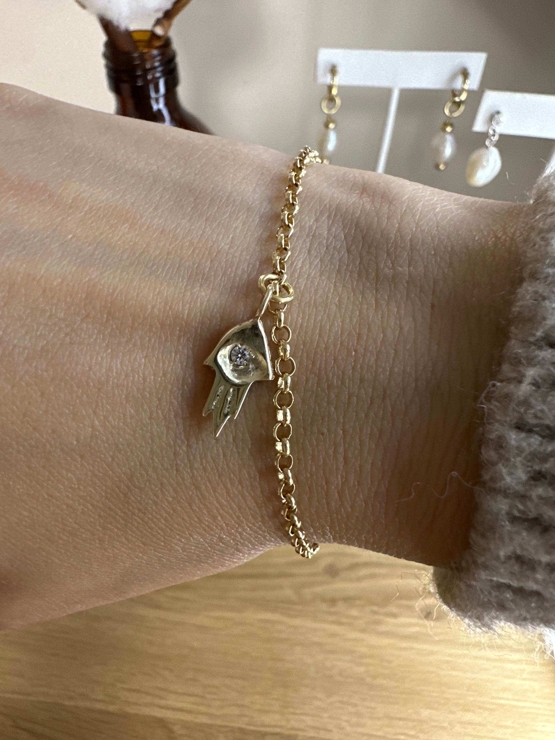 צמיד עדין וקלאסי, עשוי כולו זהב צהוב 14 קראט, עם תליון חמסה במרכז משובץ יהלום במרכז.