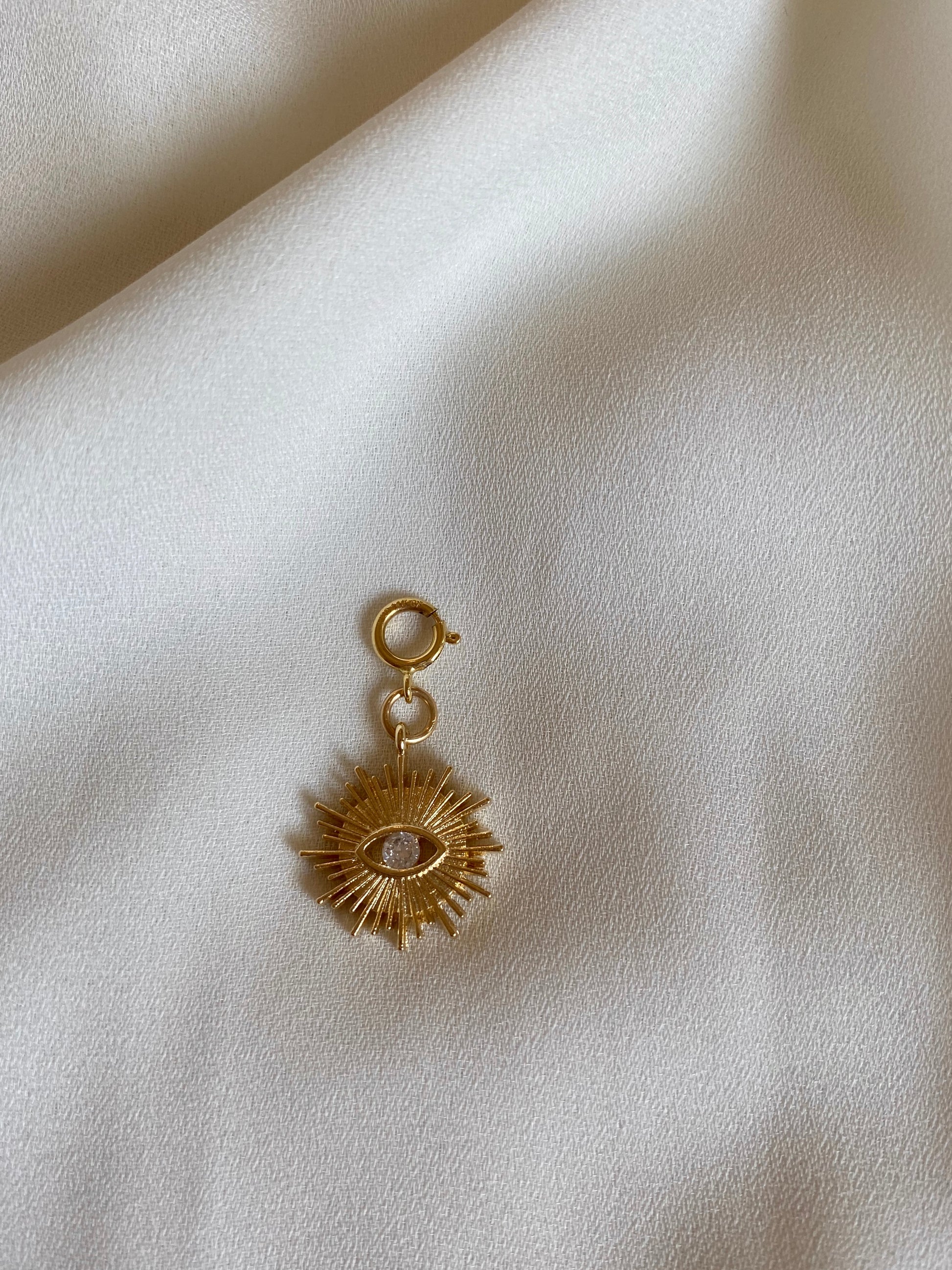 תליון עגול וחריטה של שמש שבמרכזה זרקון משובץ בצורת עין נגד ״עין הרע״.