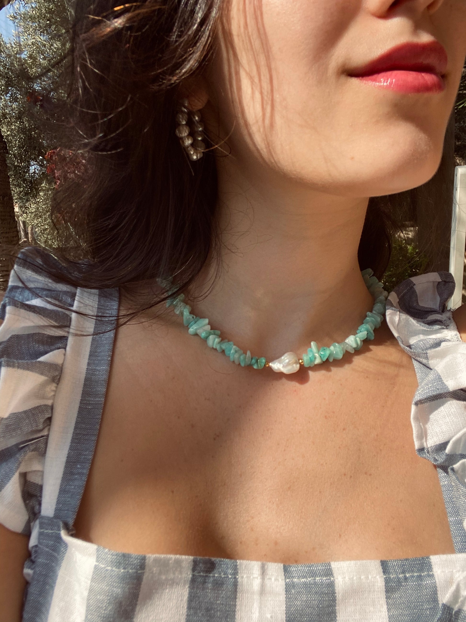 שרשרת אמזונייט עשויה אבני קוורץ בגווני טורקיז-תכלת. משלבת פנינת מים מתוקים אמיתית וחרוזי זהב 18 קראט קטנים, המחוברים על ידי חוט פלדה עמיד וסוגרי זהב 18 קארט.