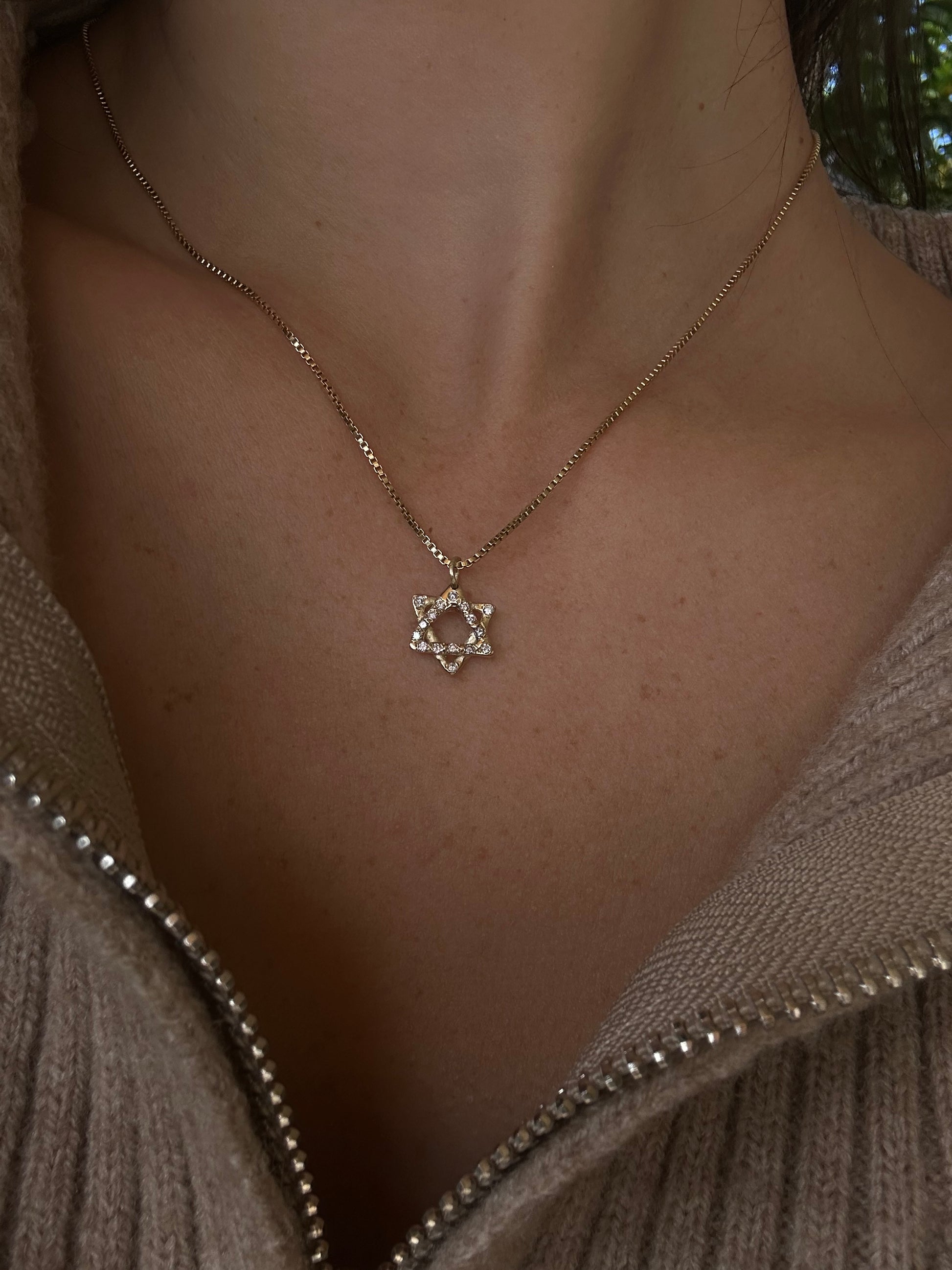 שרשרת מגן דוד עשויה כולה מזהב צהוב מלא 18 קראט. לתליון מגן דוד משובצים 16 יהלומים באיכות הגבוהה ביותר של. VS1 D color, המעניקים לשרשרת מראה מאוד יוקרתי.