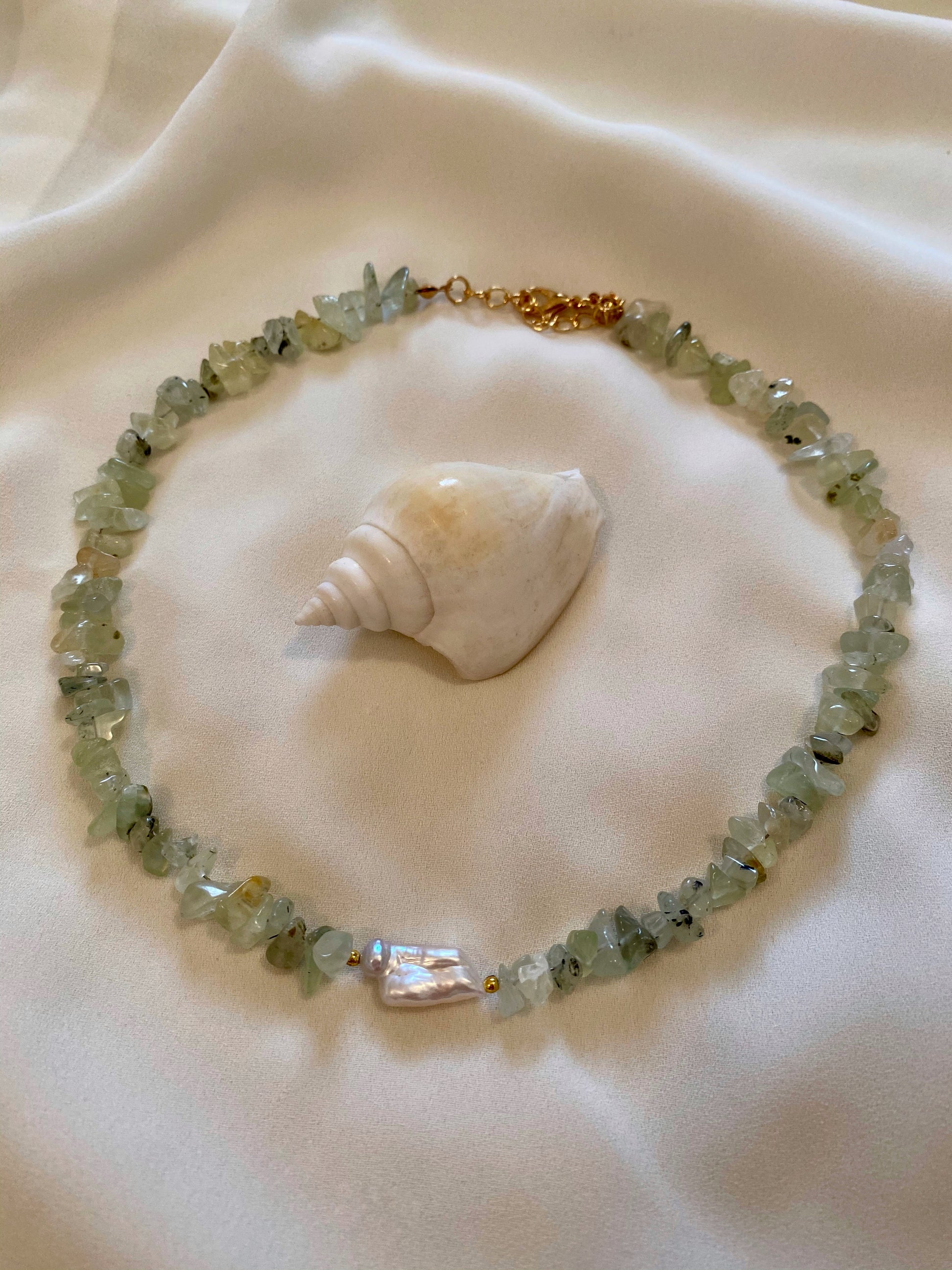 שרשרת פרהנייט עשויה אבני קוורץ טבעיות בגוון ירקרק שקפקף. משלבת פנינת מים מתוקה אמיתית וחרוזי זהב קטנים מצופים גולדפילד 14 קארט, המחוברים על ידי חוט פלדה עמיד וסוגרי זהב מצופים 14 קארט.
